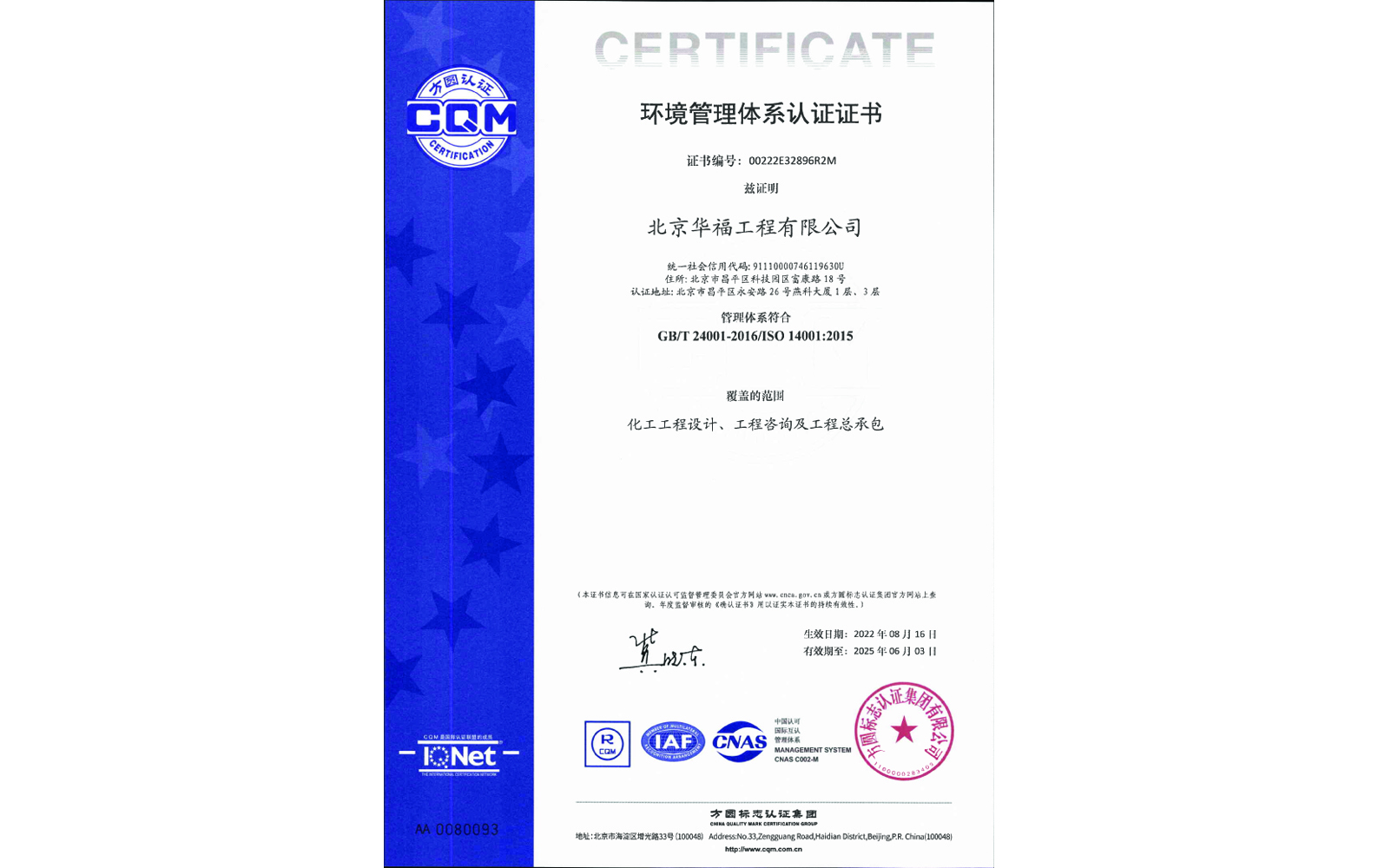環(huán)境管理體系認(rèn)證證書