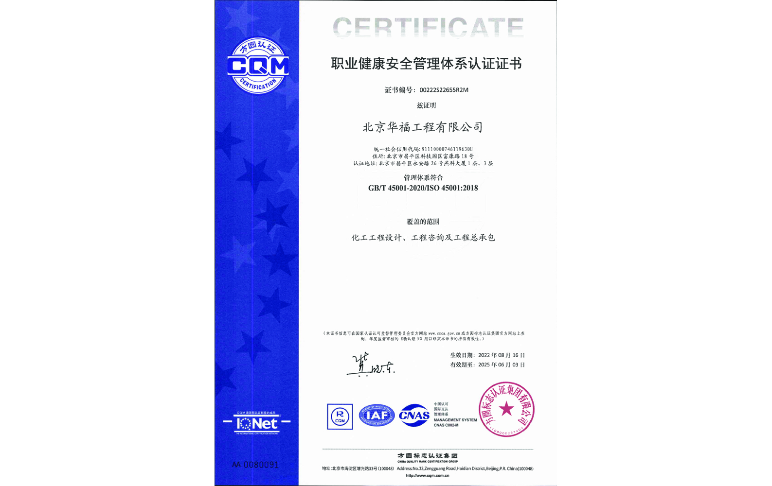 職業(yè)健康安全管理體系認(rèn)證證書